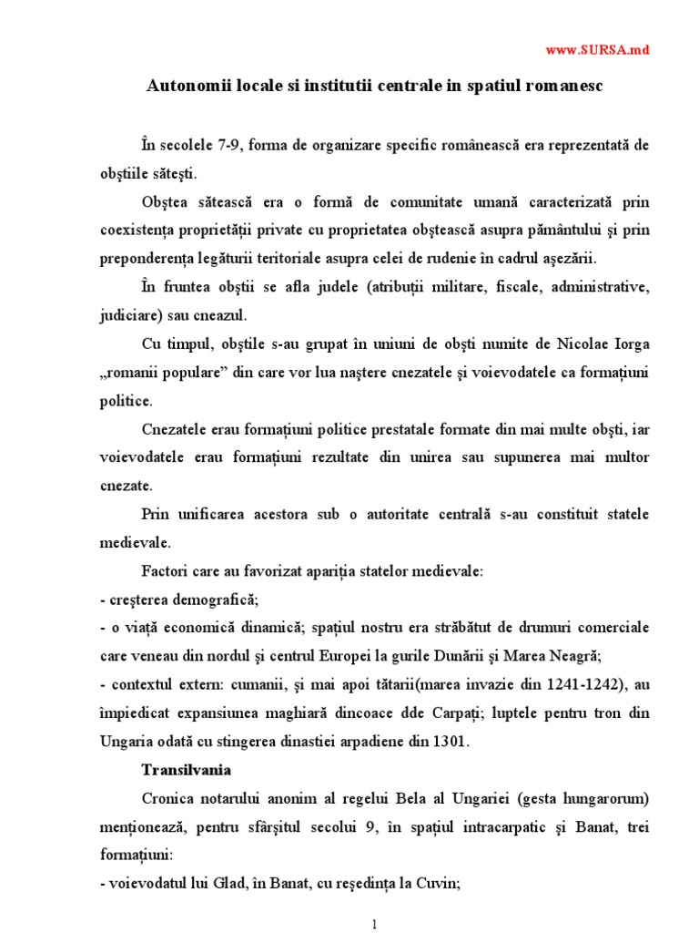 Eseu Despre Autonomii Locale și Instituții Centrale Din Spațiul Romanesc In Secolele Al Ix Lea Al Xvi Lea Liceunet Ro